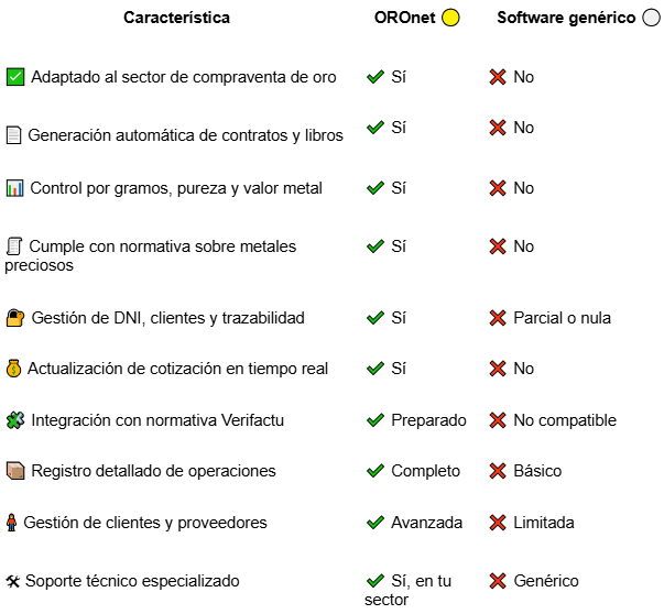Gestionar una empresa de oro no es como llevar una tienda cualquiera. Los márgenes son ajustados, la normativa es estricta y los errores se pagan caros. Por eso OROnet no es un programa genérico: es un software creado específicamente para negocios como el tuyo.